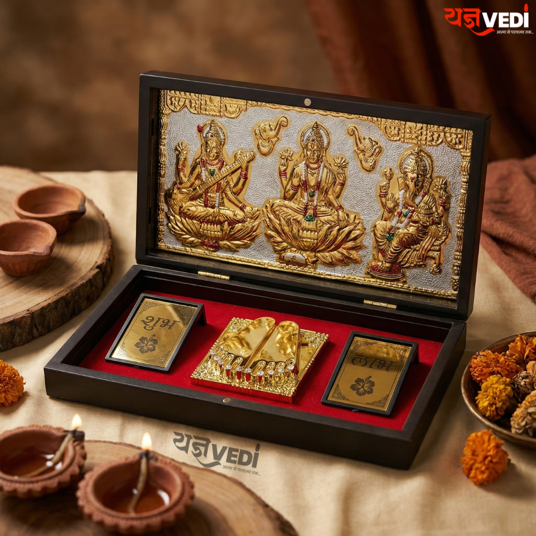 Gold Plated Lakshmi Ganesh Saraswati Charan Paduka Pooja Box
